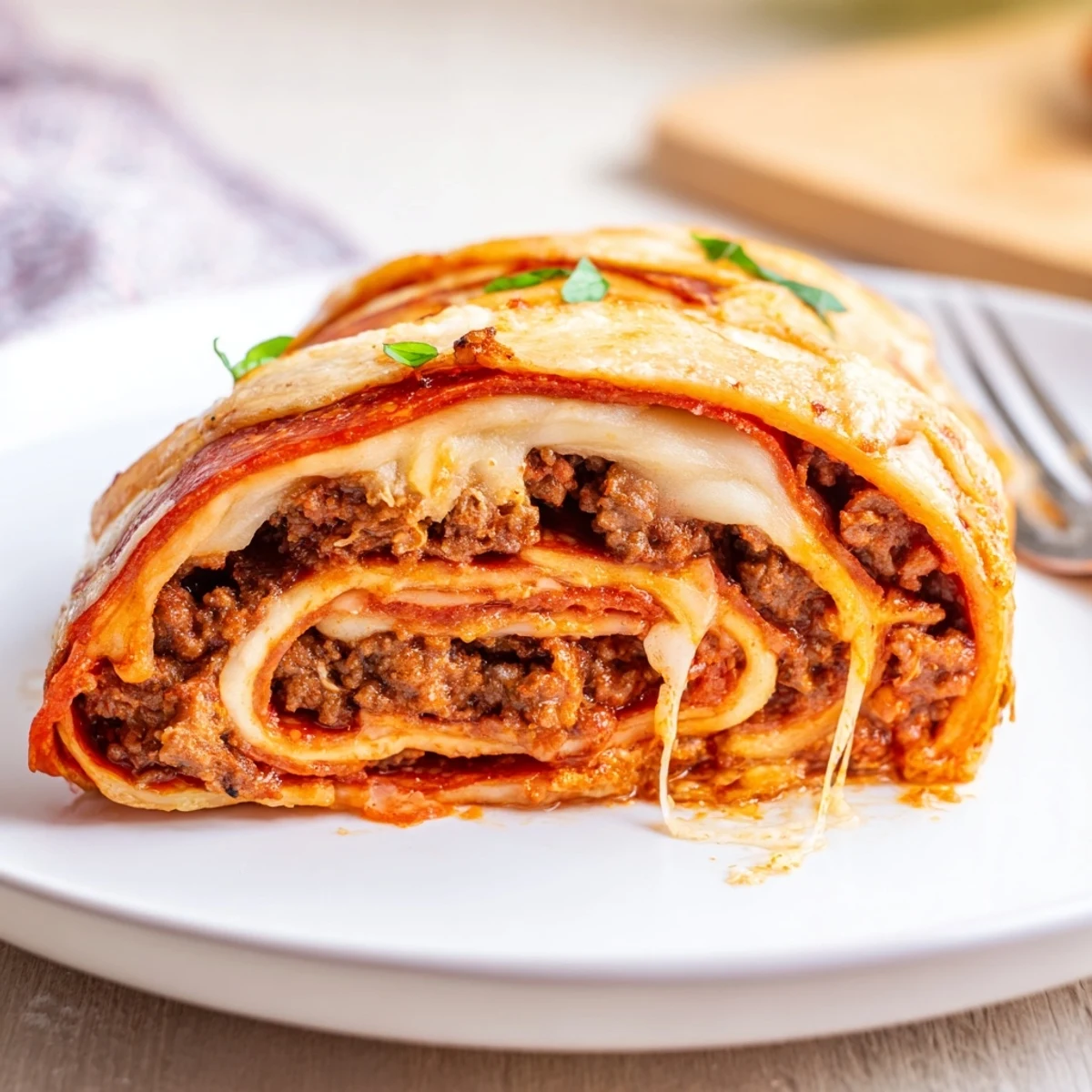 Brown seasoned ground beef with garlic and Italian herbs, drain and cool. Roll out refrigerated pizza dough, spread pizza sauce, then layer the beef, pepperoni slices and mozzarella with a sprinkle of Parmesan. Roll into a log, cut into 8 pieces, brush with olive oil and bake at 200°C (400°F) for 12–15 minutes until golden and bubbly. Let rest 3 minutes, garnish and serve with extra sauce.