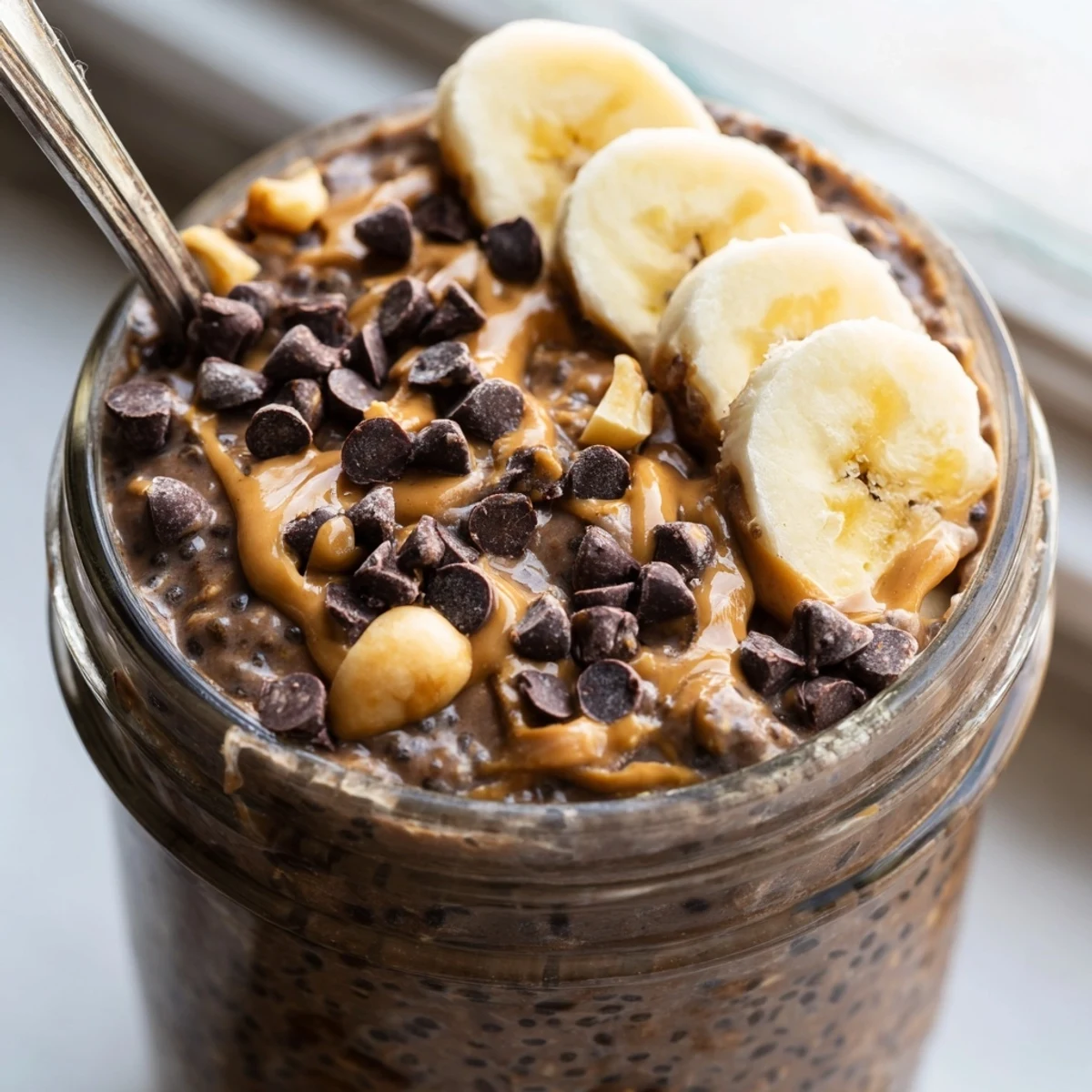These overnight oats combine the classic flavors of chocolate and peanut butter in a convenient make-ahead breakfast. Simply mix rolled oats, milk, yogurt, cocoa powder, and peanut butter the night before, then wake up to a ready-to-eat meal. The chia seeds add thickness and extra nutrition while optional toppings like chocolate chips and chopped peanuts provide satisfying crunch.