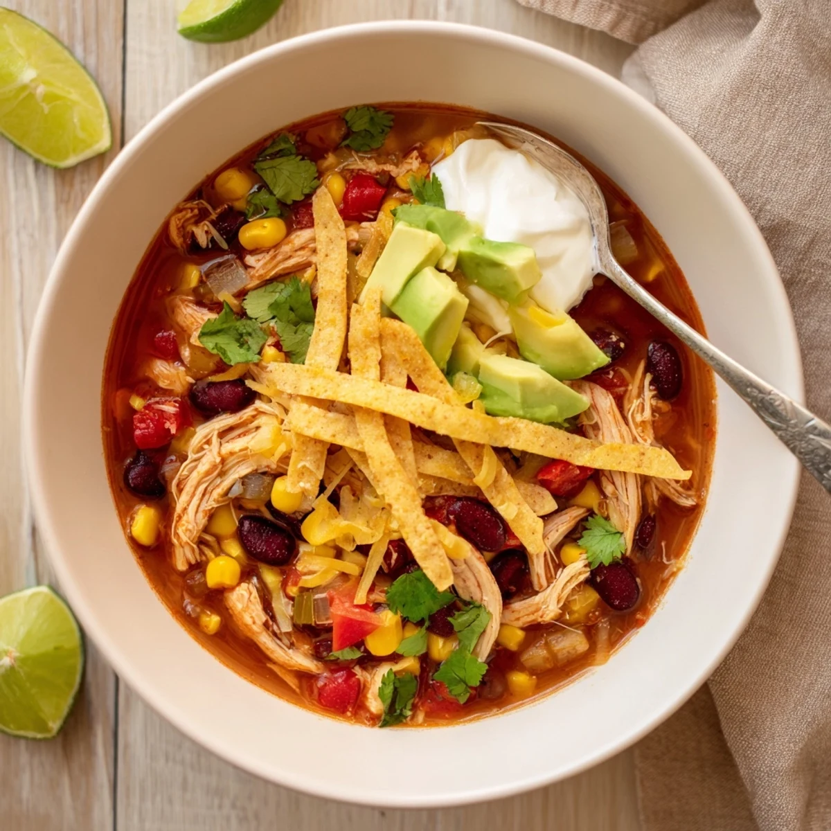 This vibrant Mexican-style soup combines tender shredded chicken with a medley of vegetables including onions, bell peppers, and jalapeños. The broth is enriched with diced tomatoes, black beans, corn, and a blend of cumin, chili powder, and smoked paprika for authentic depth. Golden baked tortilla strips add satisfying crunch, while optional toppings like creamy avocado, fresh cilantro, lime wedges, and shredded cheese let everyone customize their bowl. Ready in under an hour, this soup naturally freezes well and tastes even better the next day.