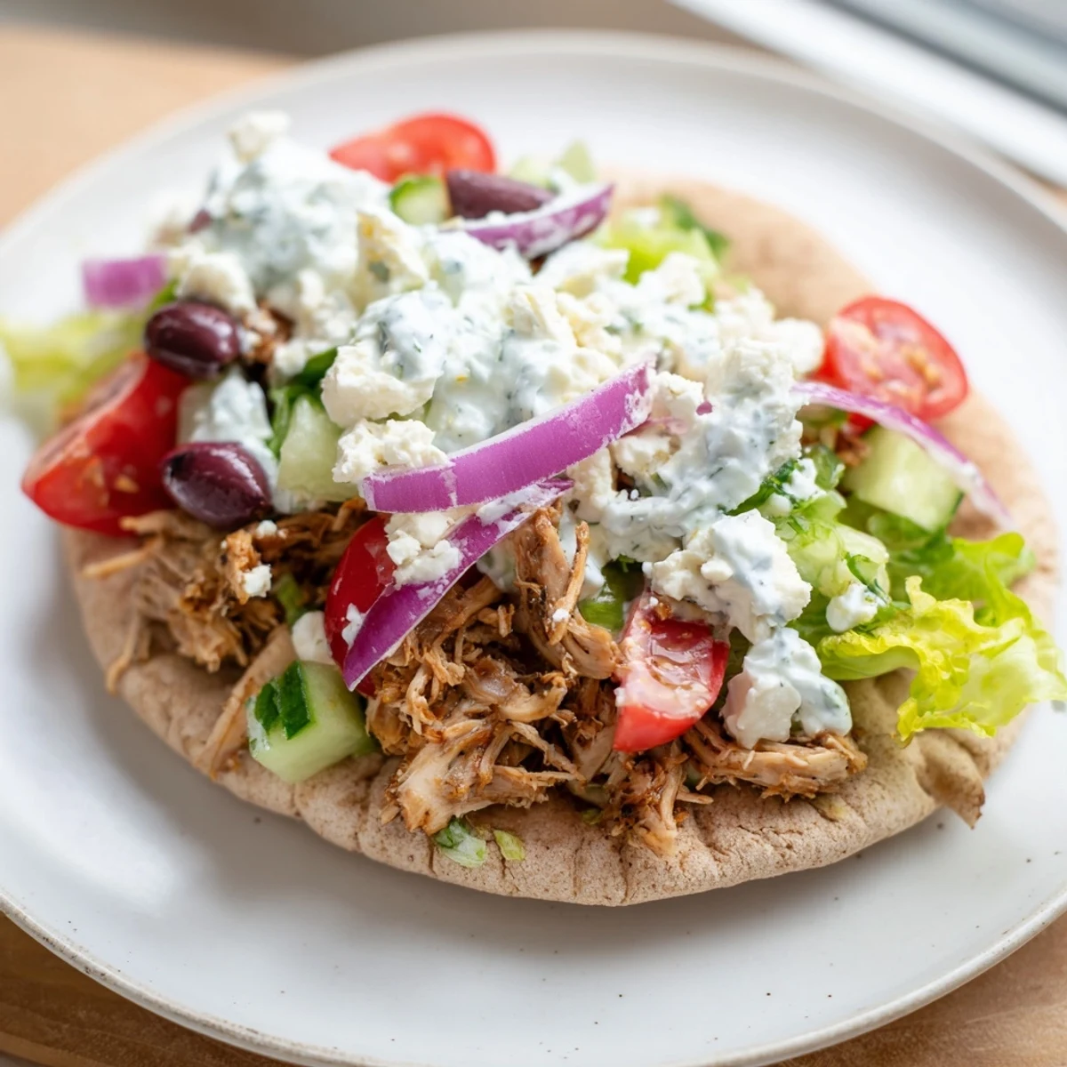 - Fill each pita with chicken, lettuce, tomatoes, red onion, feta and olives then spoon plenty of tzatziki over top.