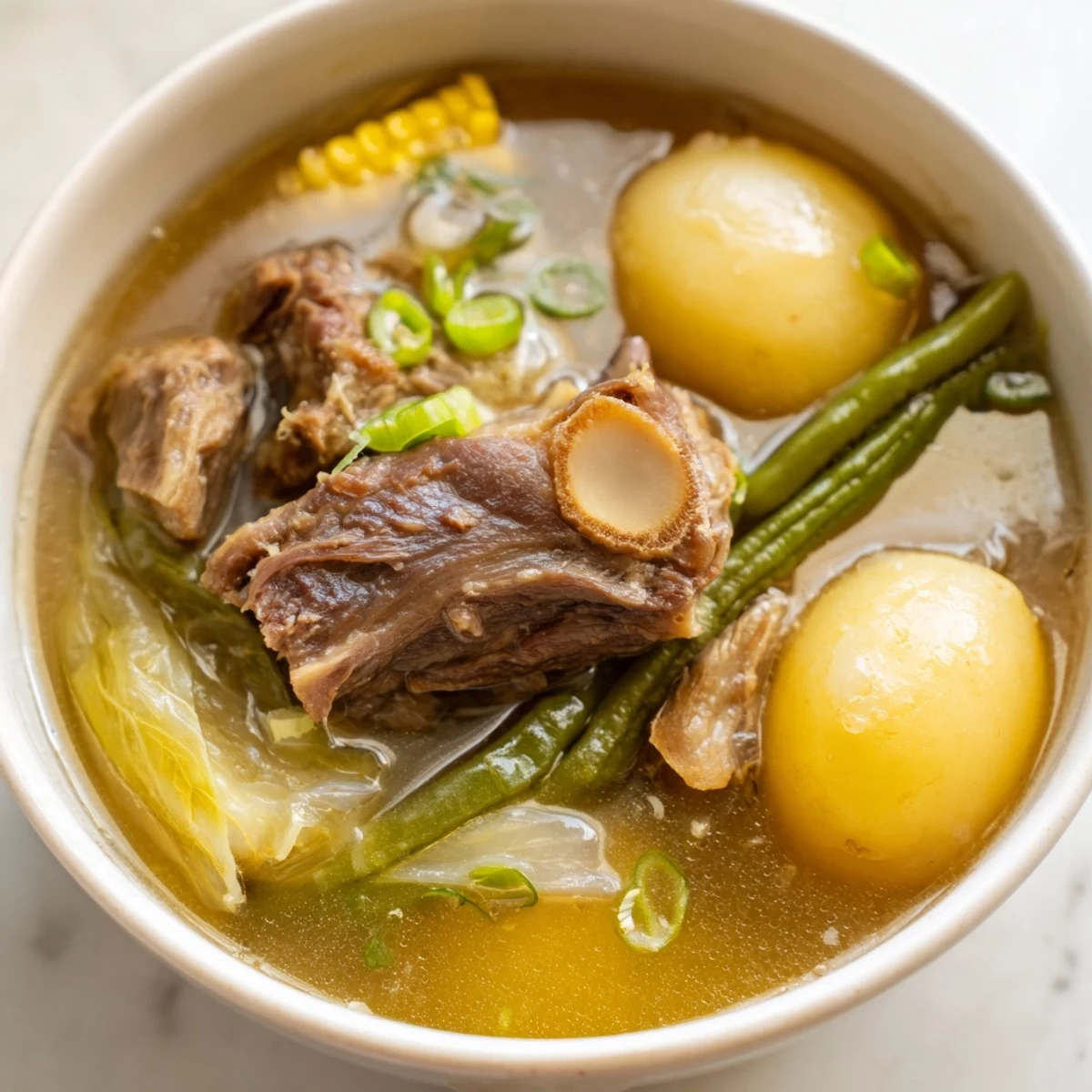 This classic Filipino soup transforms beef shank and marrow bones into a deeply nourishing broth over hours of gentle simmering. The result is tender, fall-off-the-bone meat swimming alongside corn, potatoes, cabbage, and green beans in a crystal-clear, savory soup.