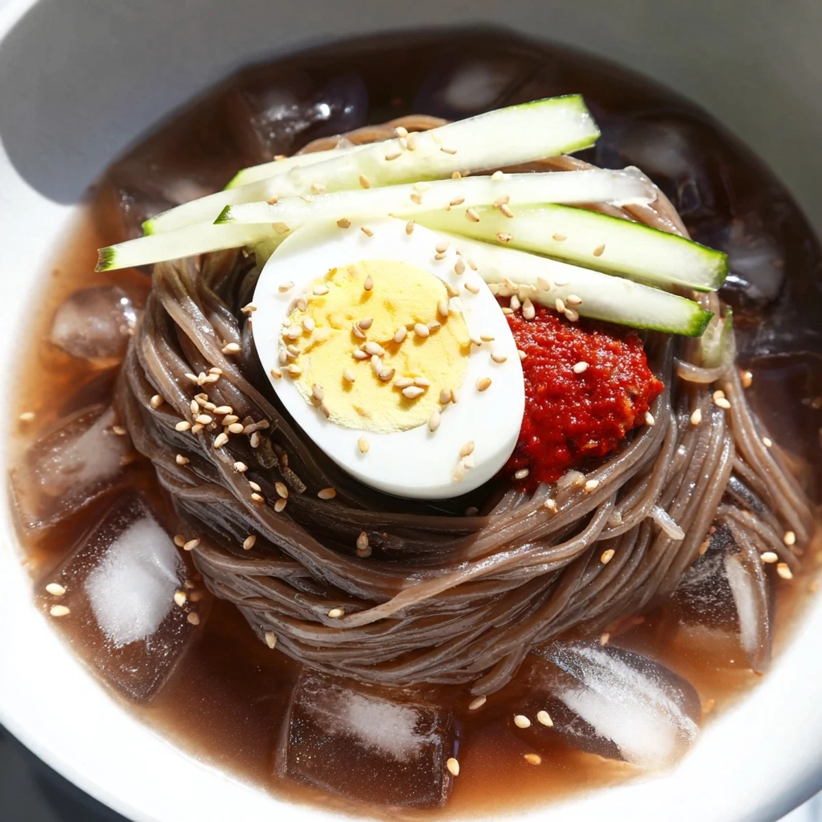 Naengmyeon noodles are made primarily from buckwheat and sweet potato starch, creating a distinctly chewy and springy texture that holds up beautifully in cold broth. The noodles are thinner than typical pasta and require thorough rinsing after cooking to remove excess starch.