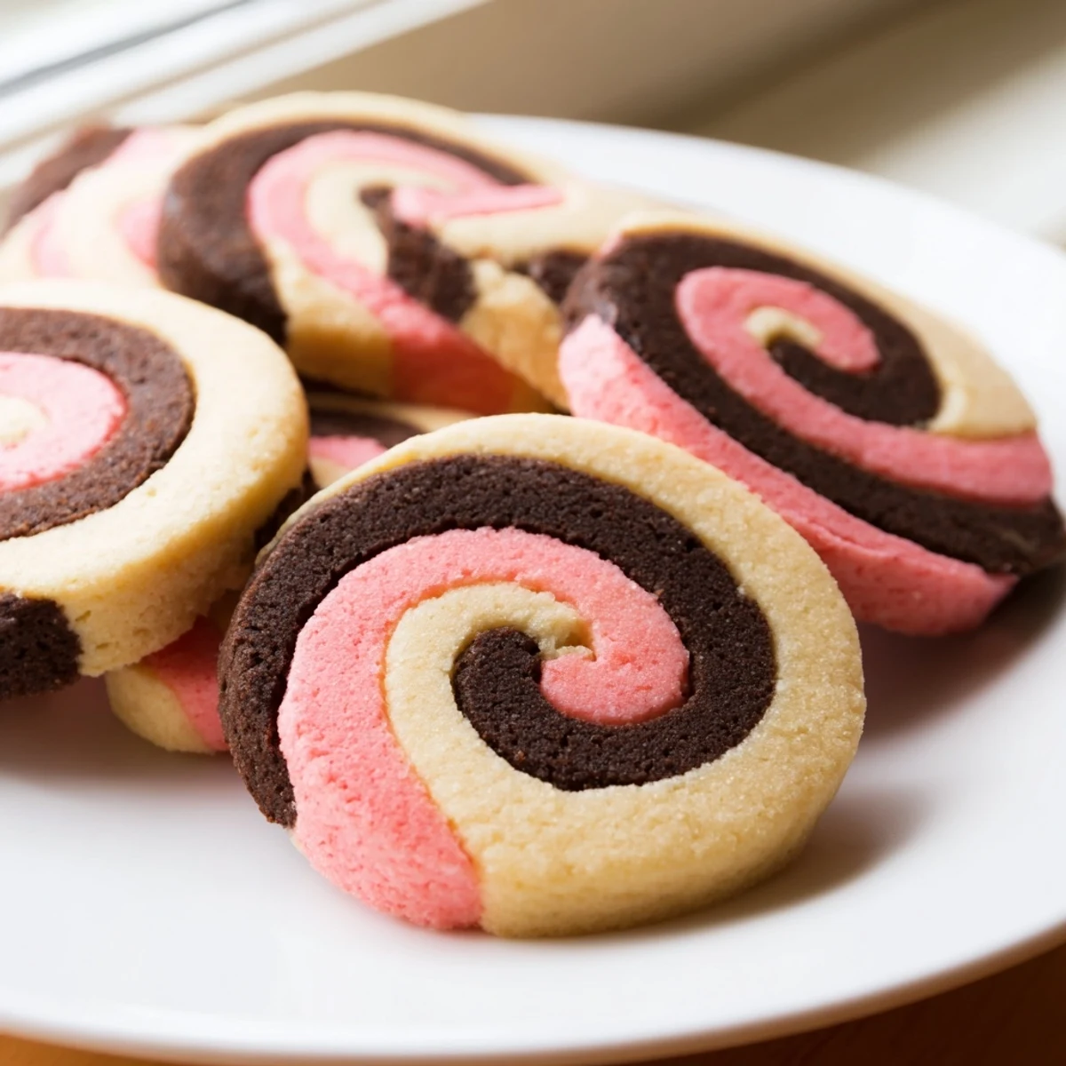 The stunning tri-color spirals create a visually striking cookie that combines classic chocolate, vanilla, and strawberry flavors in every bite. The beautiful pattern makes them perfect for special occasions and gift-giving.
