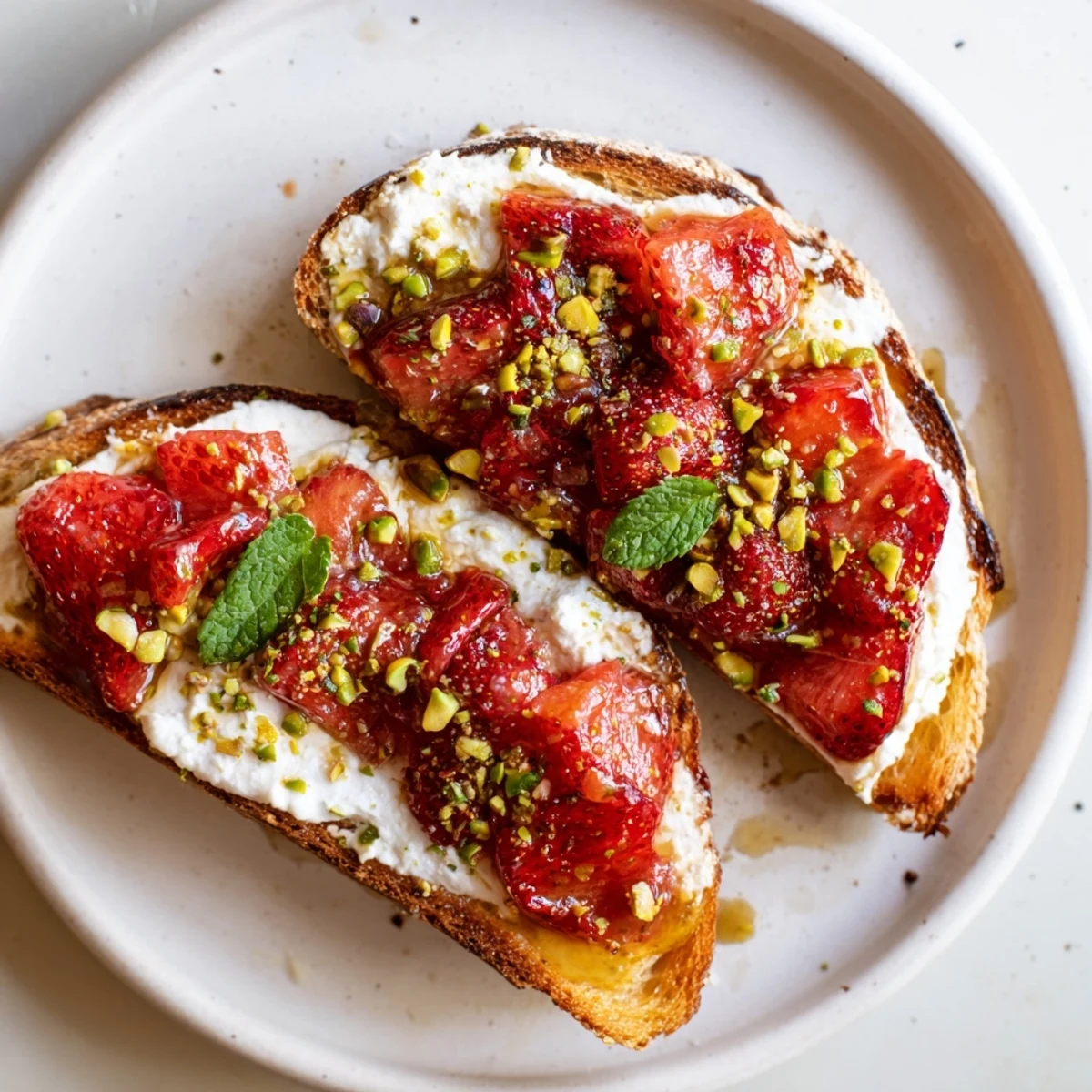 - Spread a generous layer of whipped ricotta over each piece of toast, right to the edges. Top with the roasted strawberries, spooning over some of those roasting juices because that's where all the flavor is. Finish with fresh mint, a drizzle of honey, flaky salt, and crushed nuts if you're feeling fancy.