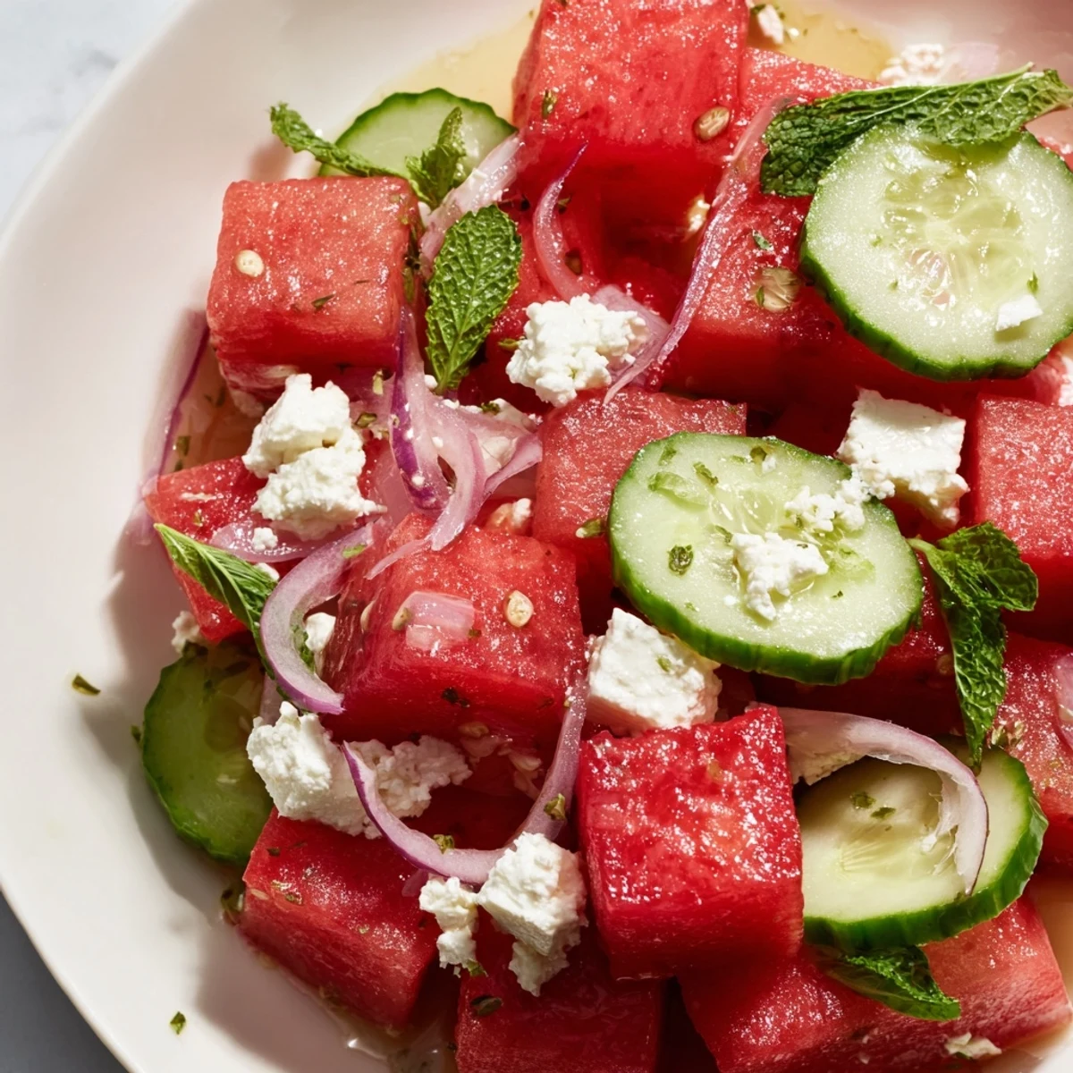 - Cut your watermelon into bite-sized cubes, about an inch thick, and place them in your largest salad bowl along with the sliced cucumber and onion. The cold watermelon against the crisp cucumber creates this incredible texture contrast that keeps every spoonful exciting.